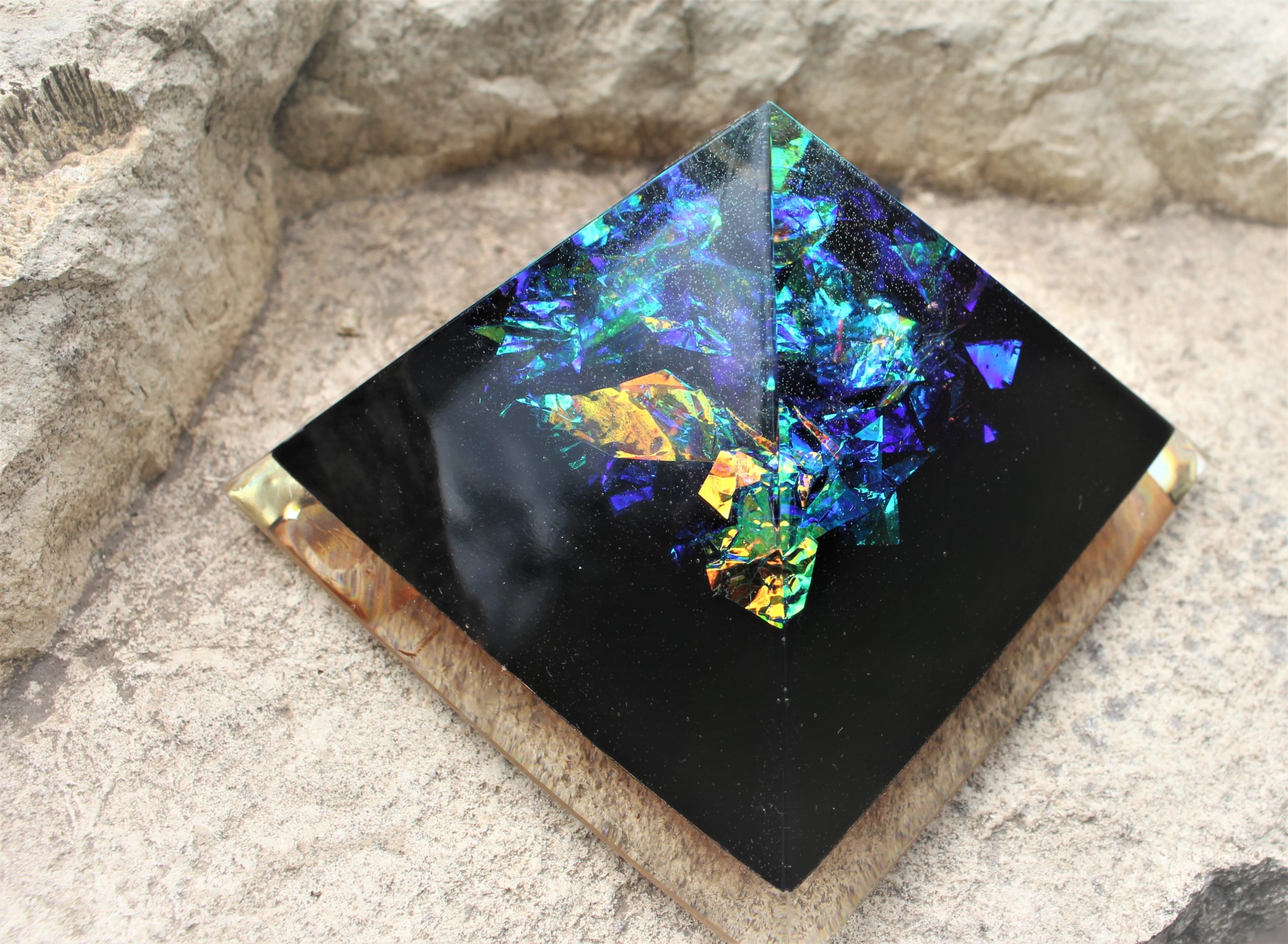 Made to order with your memorial ashes, Beautifully colorful section in the top of these pyramids (9.5cm base x 7cm tall) and have the connection frequencies with your loved ones ashes combined for a powerful healing connection experience with the ashes combined with powerful silver infused shungite, Protection & Connection as well as stunningly beautiful to bring joy to your heart. We also send you a 100% Organic Luxury Body Care Gift Set.